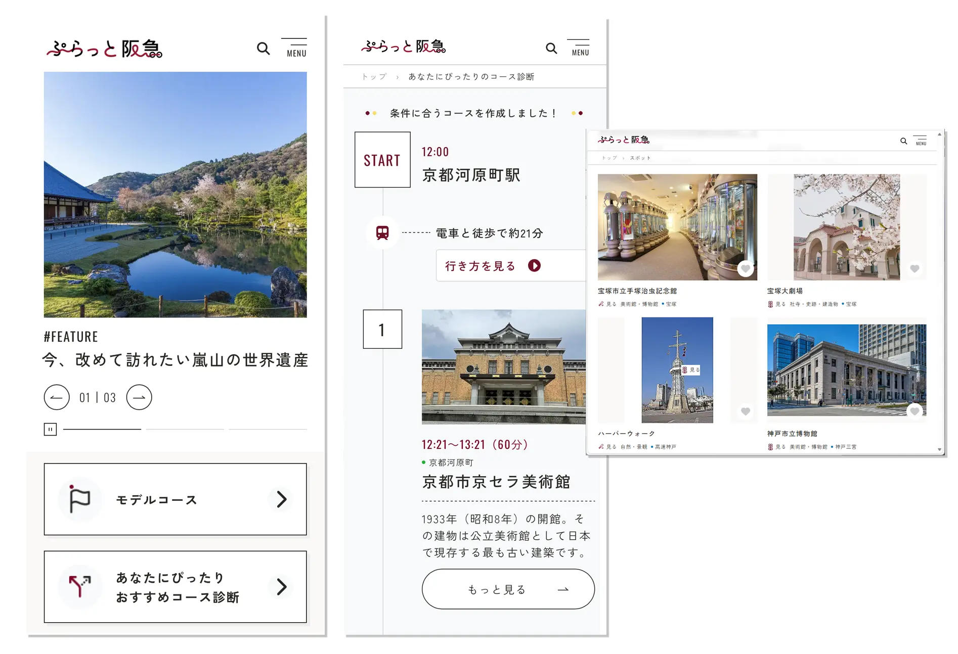 お出かけルート提案Webサービス「ぷらっと阪急」をリニューアルしました トピックス 更新日 2026年03月31日(火) お客様のニーズにあったおすすめのお出かけルートを提案するWebサービス「ぷらっと阪急」をリニューアルしました。従来の沿線スポットやイベントのご案内に加え、季節に応じたおでかけを紹介する特集記事を掲載。「おすすめコース診断」ではステップに沿って1日のおでかけスタイルをお選びいただくことで、お客様にぴったりのプランをご提案します。プラン生成後も、お好みに合わせて立ち寄りスポットや飲食店の追加・削除が可能です。春の行楽に、ぜひ「ぷらっと阪急」でお出かけプランを作成してご活用ください。 お知らせ一覧に戻る